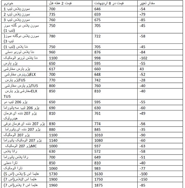 بررسی قیمت خودروهای تولید داخل در دو هفته اخیر بیانگر سقوط آزاد قیمتها است. به طور متوسط قیمت خودروهای تولید داخل و مونتاژی بیش از ۹۰ میلیون تومان در این مدت کاهش یافته است.