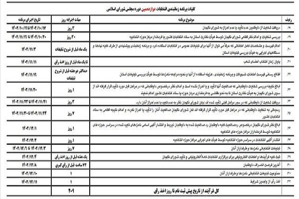 به گزارش پایگاه خبری صراط به نقل از مهر، بر اساس جدول زمان بندی انتخابات دوازدهمین دوره مجلس شورای اسلامی، از فردا دوشنبه (۱۶ مرداد ۱۴۰۲) به مدت ۷ روز تا پایان ۲۲ مرداد، ثبتنام اولیه انتخابات با عنوان پیش ثبت نام و از ساعت ۸ صبح آغاز میشود.