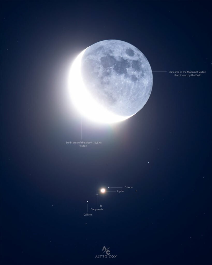 زیر ماه، قمرهای درخشان گالیلهای بهصورت مورب از چپ به راست ردیف شدهاند: کالیستو، گانیمد، آیو (بهدلیل نزدیکی زیاد به مشتری بهسختی دیده میشود) و اروپا. درواقع کالیستو، گانیمد و آیو بزرگتر از قمر زمین هستند و اروپا کمی کوچکتر است. «جونو» (Juno)، فضاپیمای رباتیک ناسا، درحالحاضر درحال چرخش به دور مشتری است و تنها یک هفته پیش از نزدیکی آیو عبور کرد.
