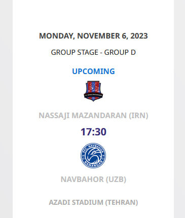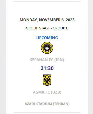 طبق برنامه جدید، در روز دوشنبه تیم نساجی ابتدا از ساعت ۱۷:۳۰ در ورزشگاه آزادی از نوبهار ازبکستان میزبانی خواهد کرد و سپس از ساعت ۲۱:۳۰ بازی سپاهان برگزار میشود.