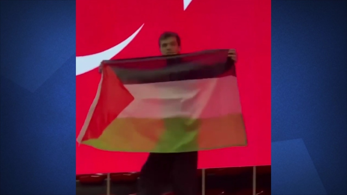 نجم الدین اربکان آکیوز، قهرمان مسابقات ووشو قهرمانی اروپا که در استانبول برگزار شد، پرچم فلسطین را روی سکو به اهتزاز درآورد و به شکل رقص محلی فلسطین رقصید.