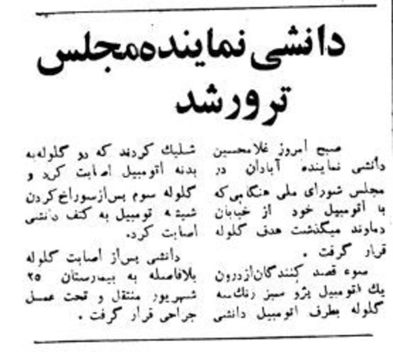 به گزارش پایگاه خبری صراط به نقل از  اطلاعات آنلاین، رسانه‌ها ۸ بهمن ۱۳۵۷ از ترور غلامحسین دانشی، روحانی سیاستمدار و مدیر رسانه‌ای در مقابل منزلش در خیابان دماوند تهران خبر دادند. دانشی (۱۳۱۵ – ۱۳۵۷) از مجریان و مدیران برنامه‌های مذهبی رادیو تلویزیون ملی ایران و نماینده مردم آبادان در مجلس شورای ملی بود. بعد از آن که آیت الله خمینی در پیامی از نمایندگان مجلس شورای ملی خواستند که با تعطیلی مجلس به مردم بپیوندند، دانشی از مقاومت در برابر اراده مردم سخن گفته بود. ترور دانشی که گروهی موسوم به سازمان موحدین آن را برعهده گرفت ناموفق بود و دانشی زنده ماند. این روحانی نماینده مجلس در ۲۲ اسفند ۱۳۵۷ پس از دستگیری در زندان قصر به اعدام محکوم شد. اخبار ترور دانشی به نقل از روزنامه اطلاعات ۸ بهمن ۱۳۵۷ را بخوانید و عکس‌هایی از جلسه محاکمه او در اسفند ۱۳۵۷ تماشا کنید.