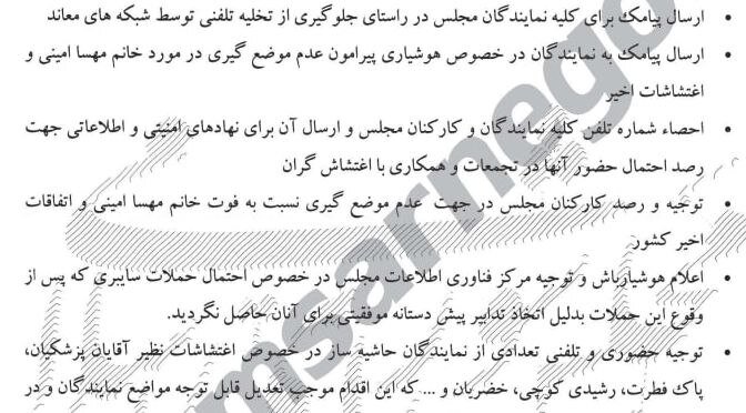 *احصاء شماره تلفن کلیه نمایندگان و کارکنان مجلس و ارسال آن برای نهادهای امنیتی و اطلاعاتی جهت رصد احتمال حضور آنها در تجمعات و همکاری با اغتشاش‌گران