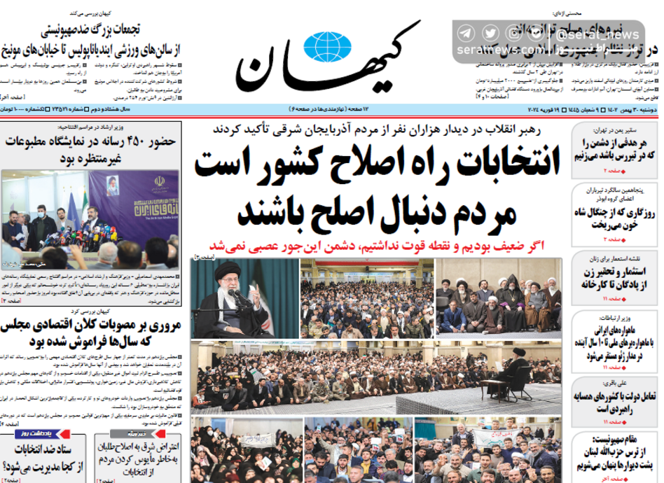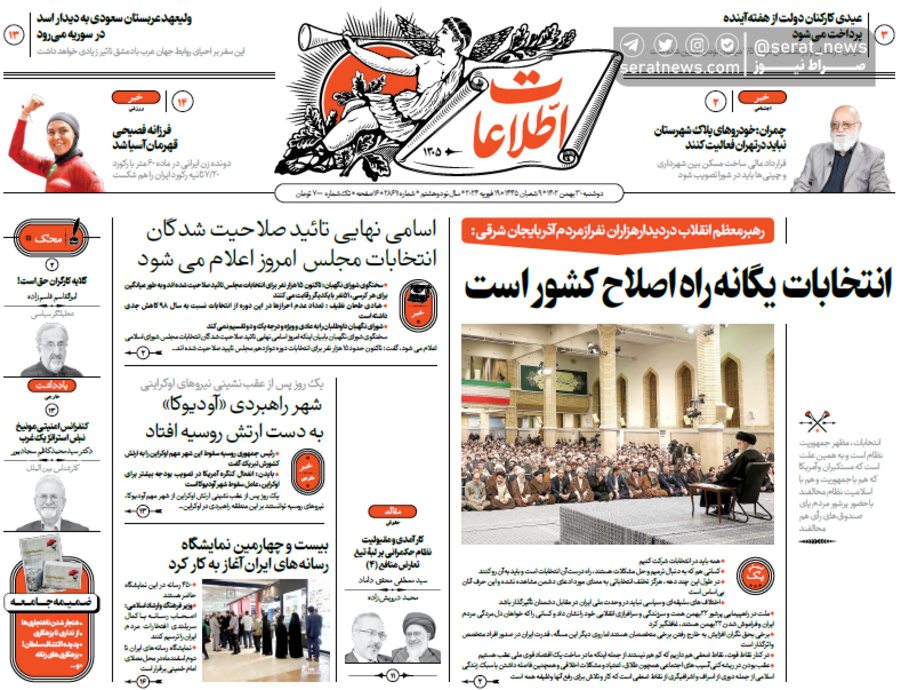 روزنامههای امروز به موضوعاتی نظیر دیدار رهبر معظم انقلاب با مردم آذربایجان شرقی و اعلام اسامی نهایی تاییدصلاحیتشدگان انتخابات مجلس پرداختهاند.