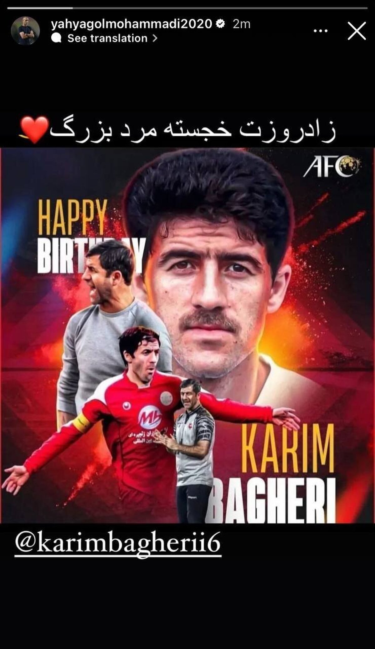 به گزارش صرای به نقل از خبرانلاین؛ یحیی گلمحمدی، سرمربی سابق پرسپولیس با انتشار یک استوری تولد 50 سالگی کریم باقری را تبریک گفت.