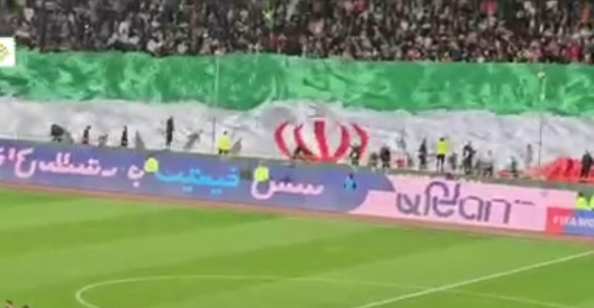 فیلم/ باز شدن پرچم بزرگ ایران روی سکوها در زمان پخش سرود ملی
