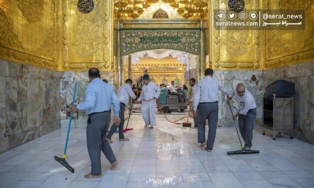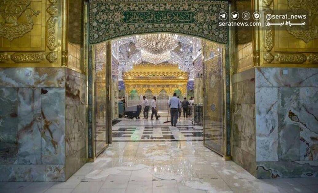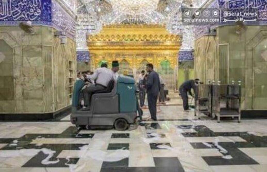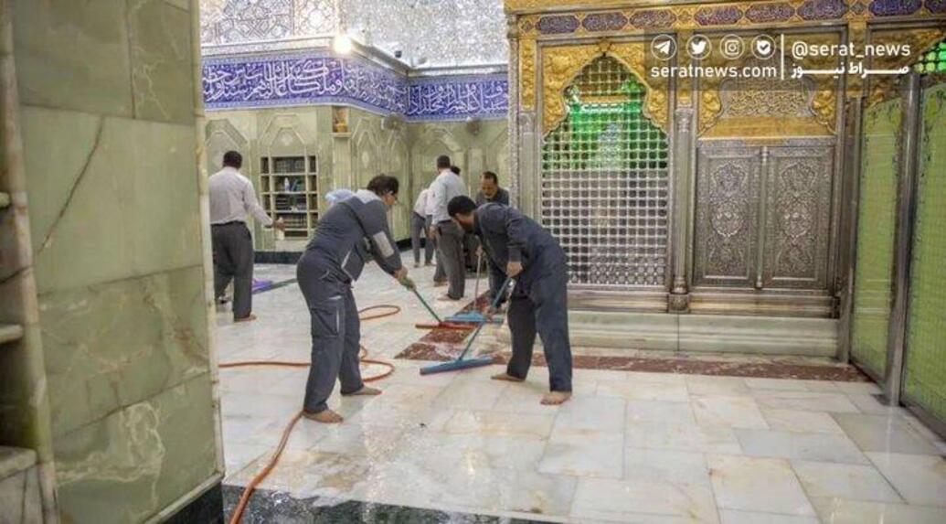 خادمان حرم حضرت عباس (ع) پس از بستن درهای ورودی به ضریح، به شستوشوی این مکان مقدس پرداختند. تصاویری از شستشوی در و دیوار حرم حضرت عباس (ع) را مشاهده کنید.
