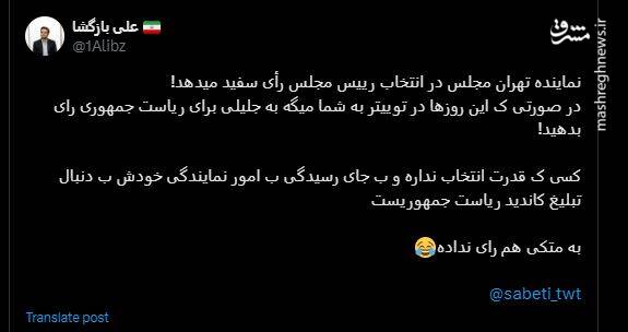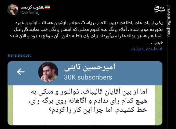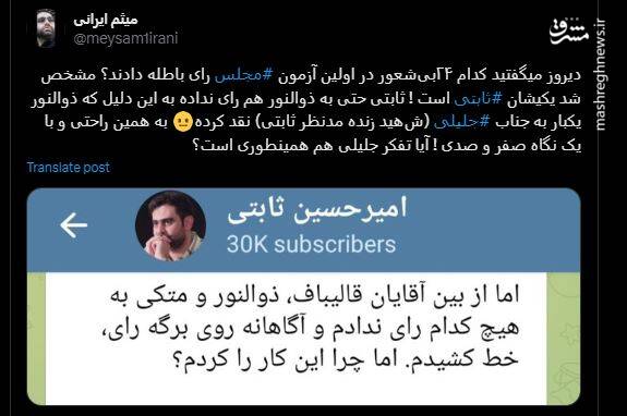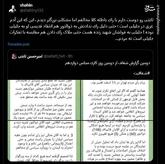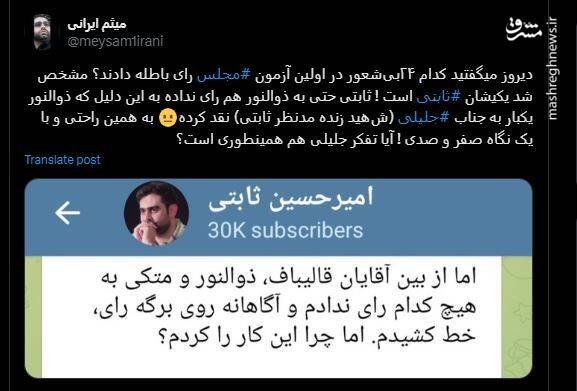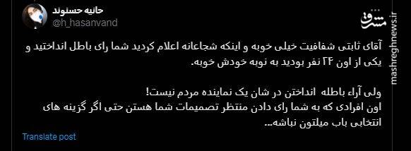 البته آقای ثابتی در یک پست تلگرامی نوشته است که هنوز با جو فضای سیاسی به خصوص روابط درونی در مجلس آشنا نشده و احتمالا این خطای بزرگ را باید به حساب ناآشنایی او نسبت به مجلس گذاشت! برخی کاربران در شبکههای اجتماعی (همان جایی که ثابتی از درونش رشد سیاسی کرد) به رای باطله واکنش نشان دادهاند که در نوع خود جالب توجه است، نماینده جوان تهران در همین ابتدای کار زیر ضرب رفته تا بداند سیاست صبر در سیاست ضرر ندارد.