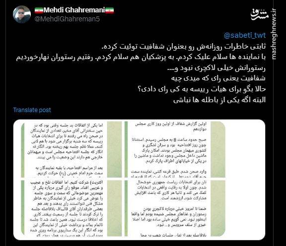 امیرحسین ثابتی، از منتخبان مجلس دوازدهم یکی از همان نمایندگانی است که رای باطله داده است، ثابتی پیش از این گفته بود که به دنبال شفاف کردن فعالیتهای خود در مجلس است طی مطلبی درباره جلسه رایگیری هیئت رئیسه نوشته است که رای باطله داده است.