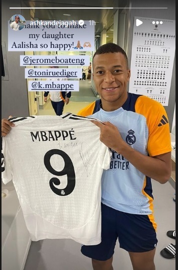 به گزارش صراط به نقل از باشگاه خبرنگاران، کیلیان امباپه ستاره رئال مادرید، کیت خود را به عنوان هدیه برای آلیشا دژاگه، دختر اشکان دژاگه، کاپیتان سابق تیم ملی فوتبال ایران امضاء کرد.