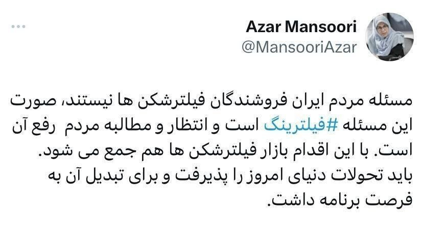 به گزارش صراط به نقل از خبرآنلاین، آذر منصوری، رئیس جبهه اصلاحات، به سخنان رئیس جمهور درباره پیگیری و برخورد با «فیلترشکن فروش ها»، در جلسه شورای عالی فضای مجازی واکنش نشان داد و در شبکه اجتماعی ایکس نوشت: مسئله مردم ایران فروشندگان فیلترشکن نیستند، صورت این مسئله فیلترینگ است و انتظار و مطالبه مردم رفع آن است. با این اقدام بازار فیلترشکنها هم جمع میشود. باید تحولات دنیای امروز را پذیرفت و برای تبدیل آن به فرصت برنامه داشت.