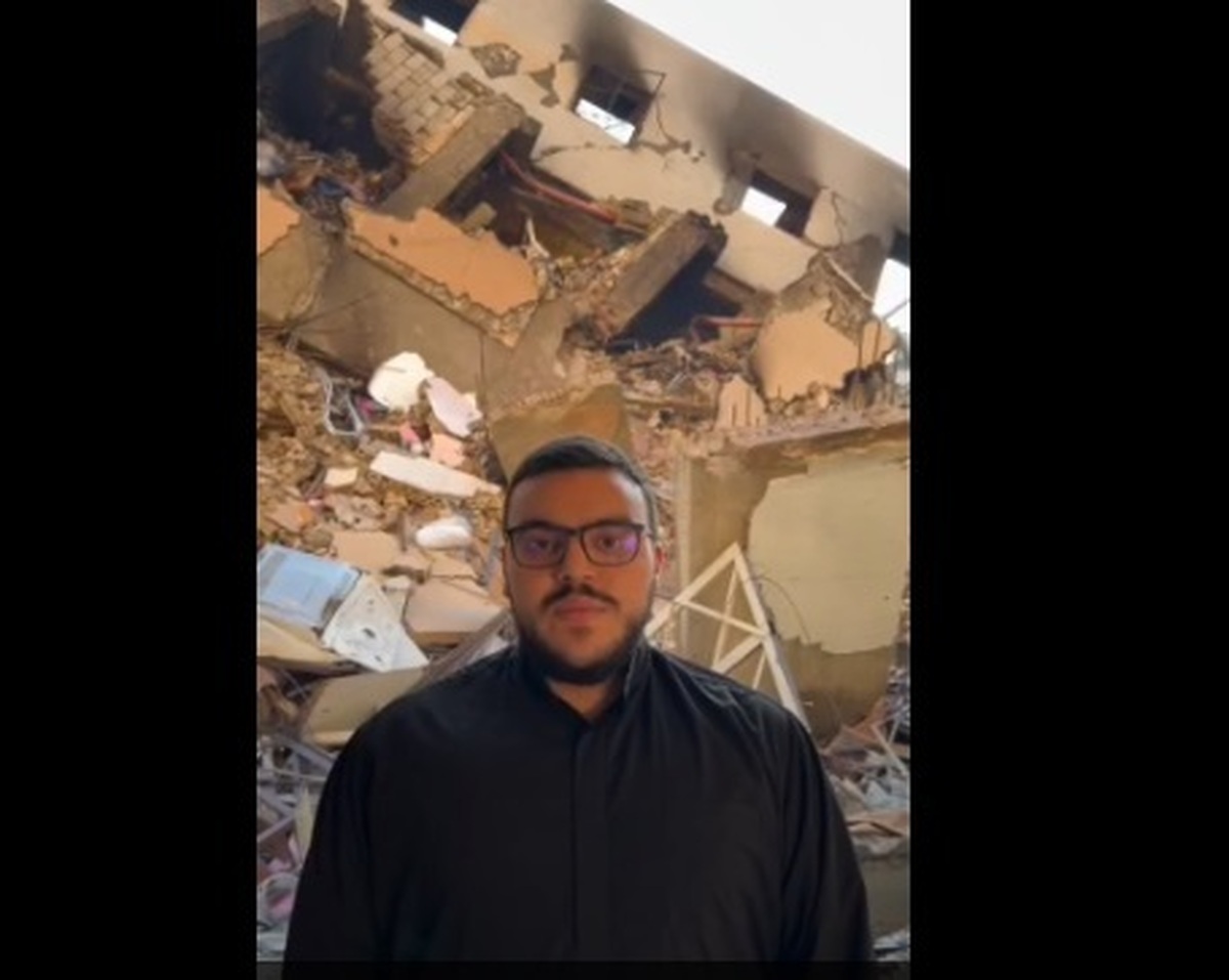سید محمدمهدی فرزند شهید سید حسن نصرالله در برابر ویرانههای خانهشان در حارة حریک ایستاده و خدا را شکر میکند که خانواده نصرالله با خون پاک و آواره شدن از خانه، با ملت مقاوم و شجاع و فداکار همراهی کرده است.