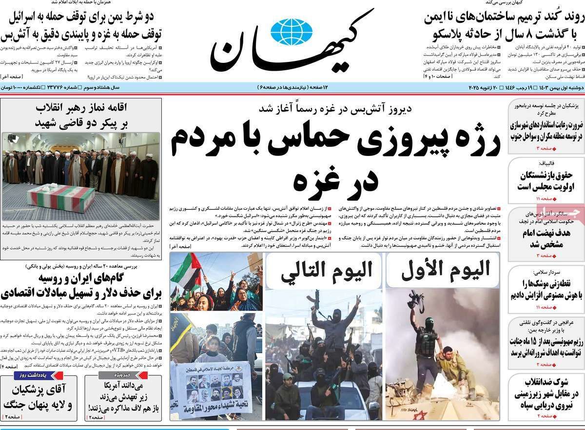 شروع رسمی آتش بس بین حماس و اسرائیل، تمام سناریوهای ترور دو قاضی عالیرتبه، ساعت صفر ترامپ و ... از موضوعات مطرح در روزنامه های امروز است.