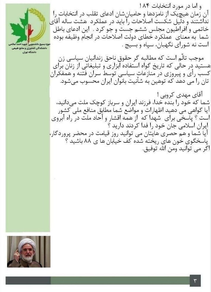 چه طور از حقوق مردم ایران سخن می گویید درحالی که لکه ننگ فتنه سبز بر دامن شما و آقای موسوی نشسته است و مال و جان مردم را فدای عقدهها و منافع شخصی عده ای کردید و با لجبازی و دهن کجی به رای ملت ، موجبات آسیب دیدن اموال عمومی، کشته شدن شهروندان و بر هم زدن نظم عمومی را فراهم کردید.