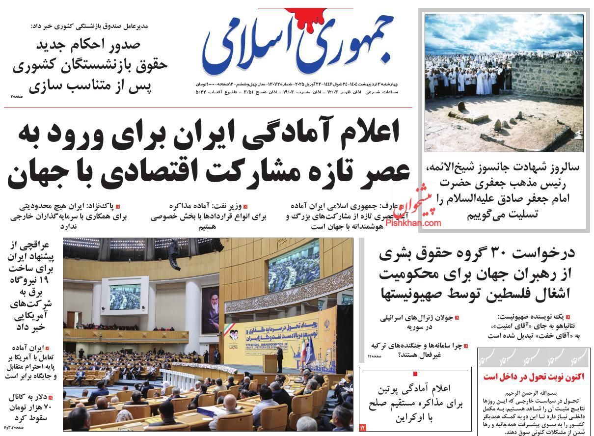 عناوین روزنامههای پنجشنبه ۴ اردیبهشت ۱۴۰۴