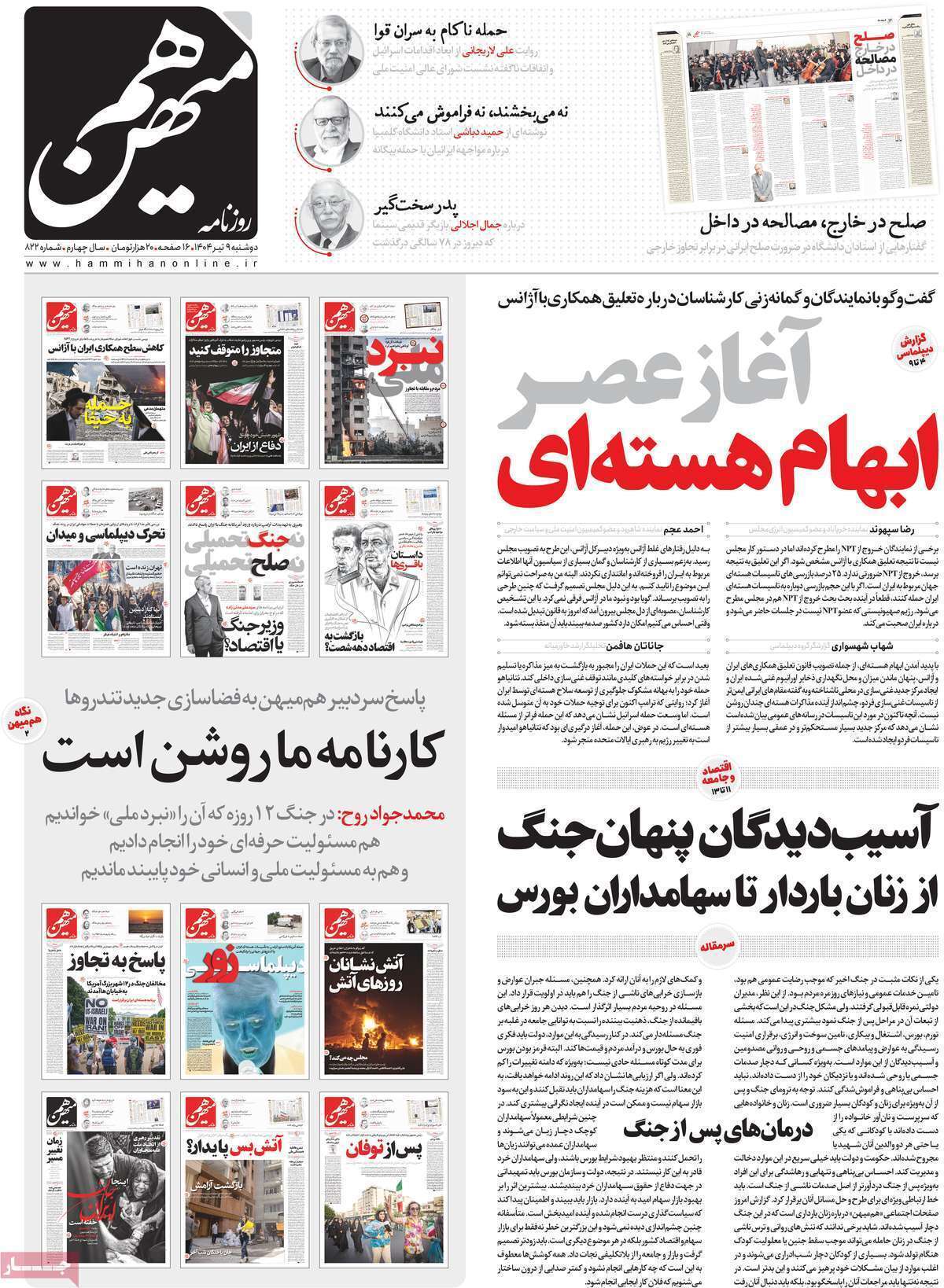 روزنامه‌های امروز به موضوعاتی نظیر تشییع پیکر مطهر شهدای جنگ تحمیلی با صهیونیست‌ها و نابودی تاسیسات و مراکز مهم اقتصادی در سرزمین‌های اشغالی پرداختند.
