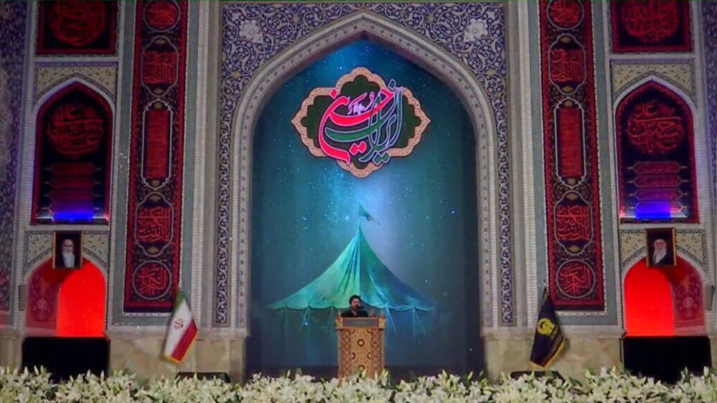در بخش آیینی مراسم، میثم مطیعی، مداح اهلبیت(ع)، با نوای گرم و شعری حماسی، فضای مراسم را به مجلس روضه عاشورایی و حماسی بدل کرد. سرودههای او، روضهخوانیهای عاشقانه و انقلابی، دلهای حاضران را از کربلای تاریخ تا غزه و مشهد امروز پیوند داد.