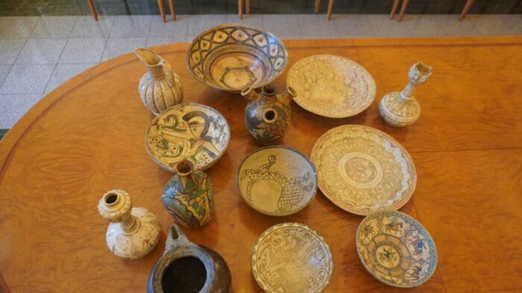 از میان این آثار، دوازده اثر باستانی شامل بطری‌ها، کاسه‌ها، تنگ‌ها و بشقاب‌های سرامیکی تزئینی متعلق به دوره‌های تاریخی مختلف همچون قاجار (قرن نوزدهم)، نیشابور (قرن دهم)، طبرستان (قرون دهم و یازدهم)، زرین‌فام (قرن هفتم)، کاشان (قرون دوازدهم و سیزدهم)، کاشان/گرگان (قرون دوازدهم و سیزدهم) و سفال مینایی ری (قرن سیزدهم) است.