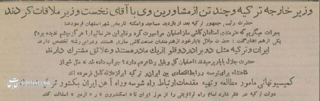 به گزارش صراط به نقل از ایسنا، اطلاعات آنلاین نوشت: جلال بایار، سومین رئیس جمهور کشور ترکیه در شهریور ۱۳۳۴ وارد تهران شد. روزنامه اطلاعات اول مهر ۱۳۳۴ گزارشی از سفر رئیس جمهور ترکیه به اصفهان و نحوه پذیرایی از او منتشر کرد. عکس قلیان کشیدن بایار در باشگاه افسران ترکیه مورد توجه رسانهها قرار گرفت. عکسهای حضور بایار در اصفهان را تماشا کنید.