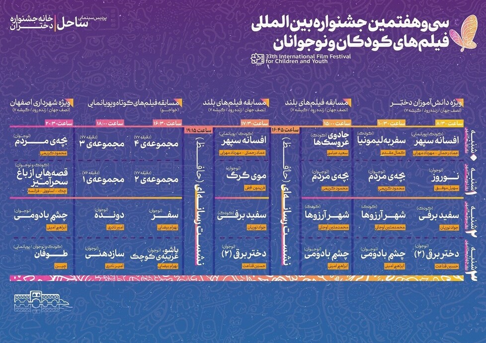 به گزارش صراط به نقل از تسنیم، جدول نمایش فیلمهای سیوهفتمین جشنواره بینالمللی فیلمهای کودکان و نوجوانان در اصفهان اعلام شد.