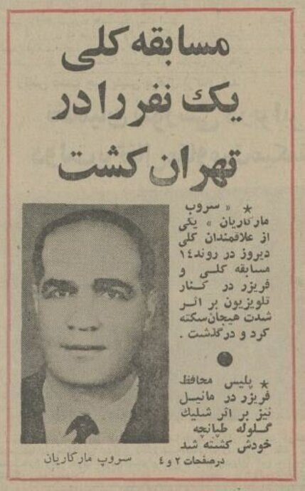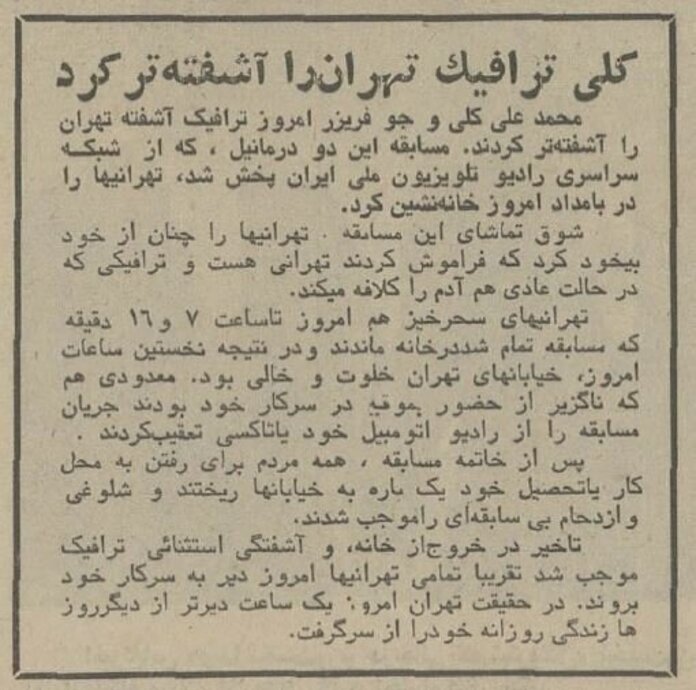 به گزارش صراط به نقل از ایسنا، در ساعات آغازین روز ۹ مهر ۱۳۵۴ مسابقه بوکس سنگین وزن بین محمد علی کلی و جو فریزر در پایتخت فیلیپین برگزار شد. پخش زنده این مسابقه توسط تلویزیون ملی ایران باعث بهم ریختن خیابانهای تهران و مرگ یک شهروند ارمنی از اهالی تهران شد. خبرها را به نقل از روزنامه اطلاعات ۹ و ۱۰ مهر ۱۳۵۴ بخوانید.