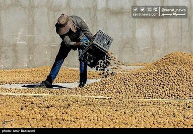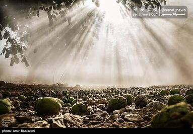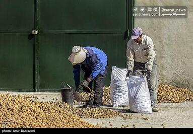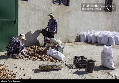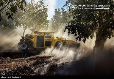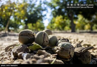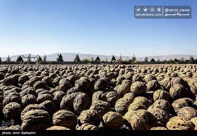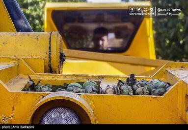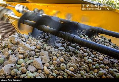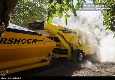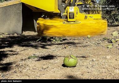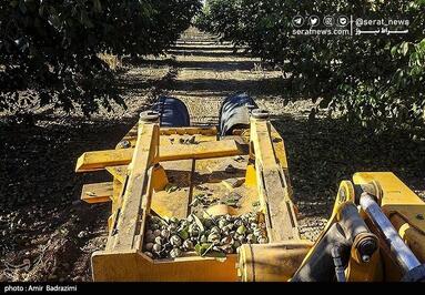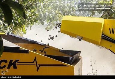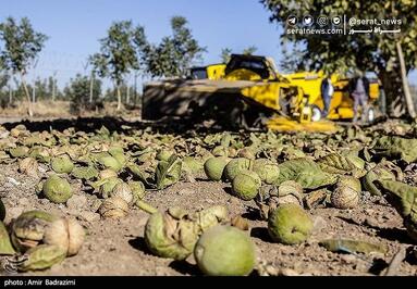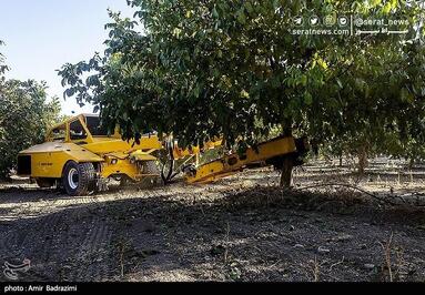 تصاویر| برداشت گردو اصلاح شده با دستگاه مکانیزه