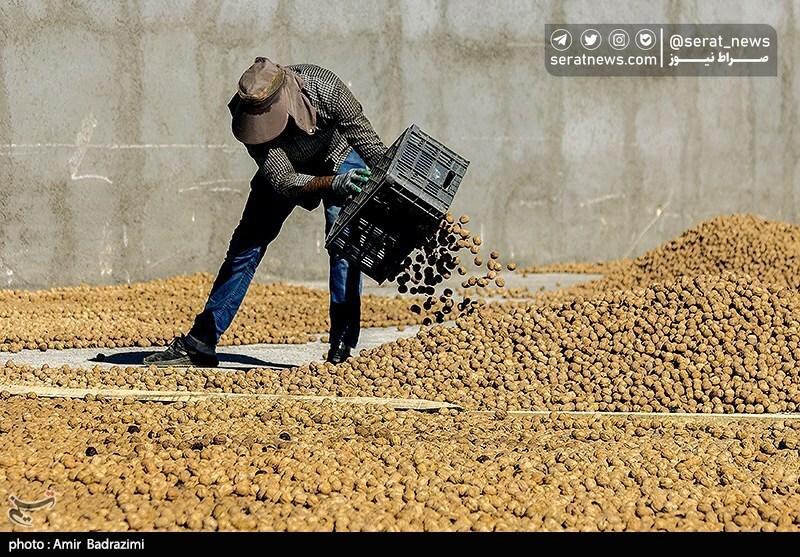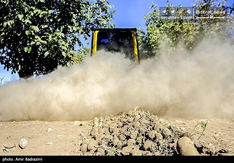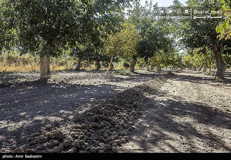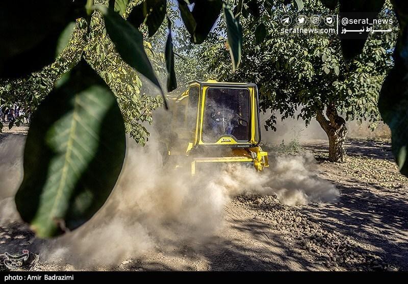 تصاویر| برداشت گردو اصلاح شده با دستگاه مکانیزه