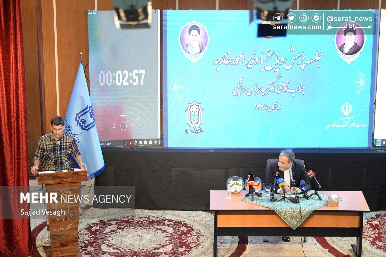 صبح امروز ۱۵ آبان ماه ۱۴۰۴، جلسه پرسش و پاسخ دانشجویی "نقشه راه سیاست خارجی پساجنگ" با حضور دکتر سید عباس عراقچی در دانشگاه بوعلی سینای همدان برگزار شد. در این نشست وزیر امور خارجه به سوالات دانشجویان درباره سیاست خارجی پاسخ دادند. این برنامه با حواشی دانشجویان موافق و مخالف برجام همراه بود.
