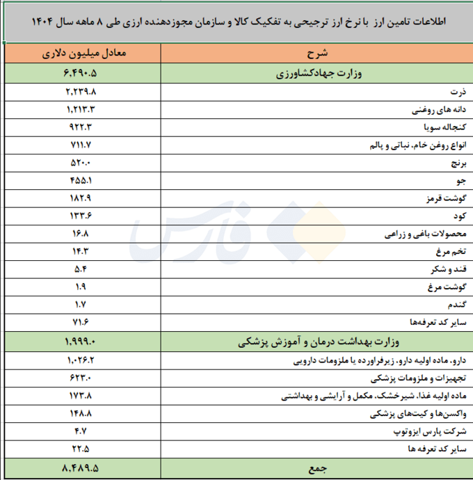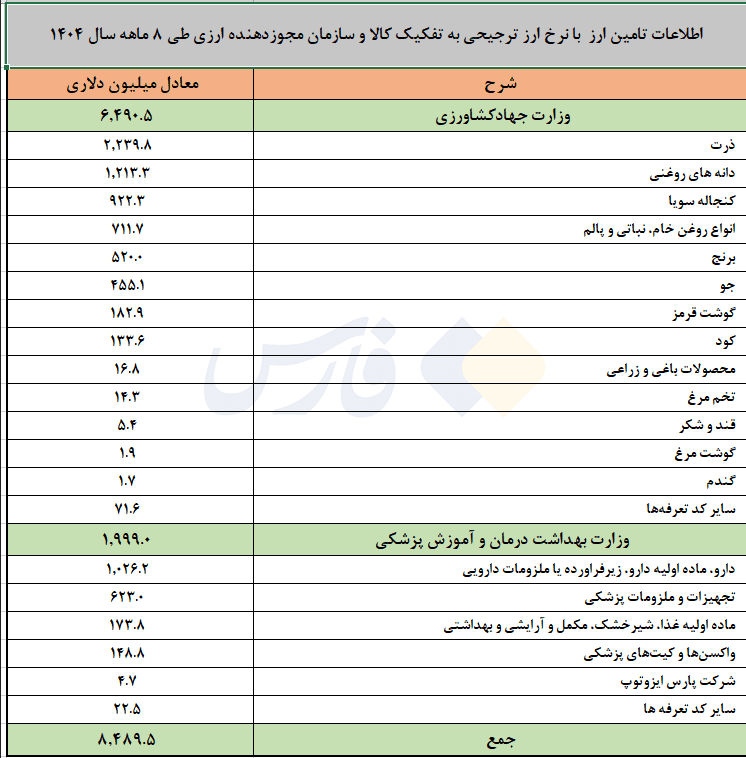 بانک مرکزی همچنین میزان تأمین ارز ترجیحی دو وزارتخانه جهاد کشاورزی و وزارت بهداشت را به تفکیک نوع کالای وارداتی و میزان ارز تأمینشده منتشر کرده است.