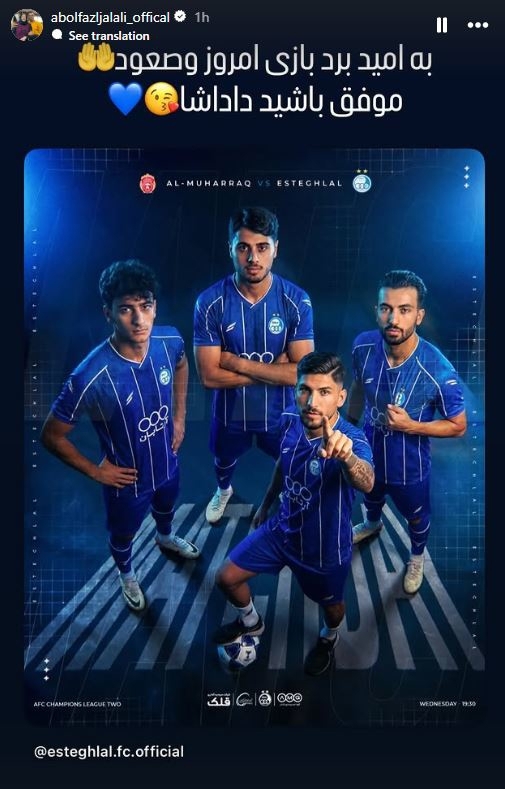 پس از کنار گذاشته شدن از فهرست سفر، رامین رضاییان با انتشار یک استوری، برای موفقیت استقلال آرزوی برد و صعود کرد و حالا ابوالفضل جلالی نیز واکنشی مشابه نشان داده است.