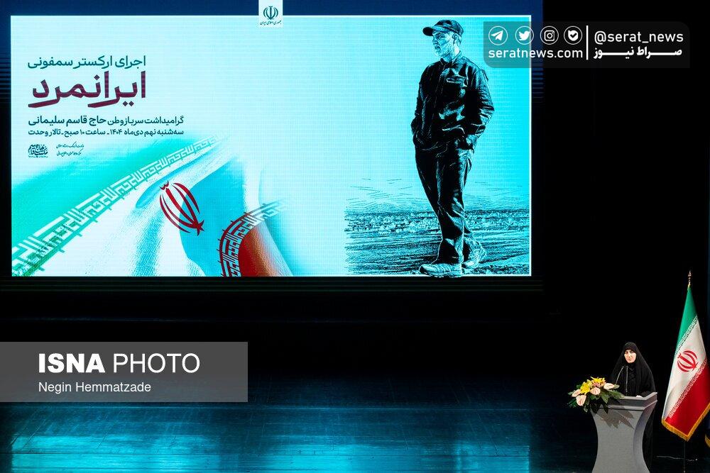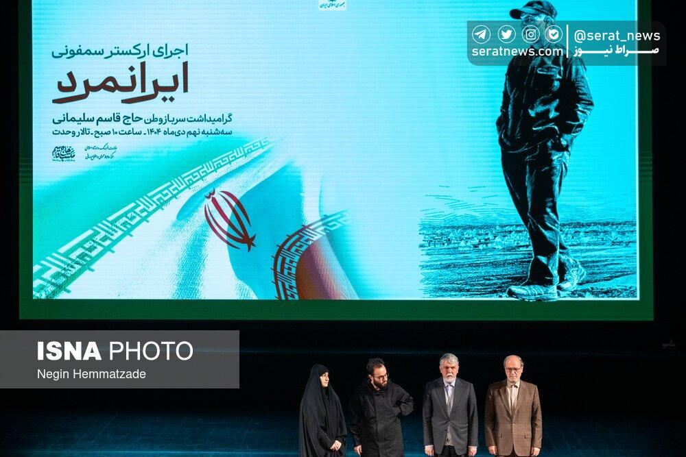 اجرای سمفونی «ایران مَرد» توسط ارکستر سمفونیک تهران صبح امروز سه شنبه ۹ دی ماه ۱۴۰۴، به مناسبت سالگرد سردار قاسم سلیمانی با حضورسیدعباس صالحی، وزیر فرهنگ و ارشاد و ایرج مسجدی، معاون هماهنگ‌کننده نیروی قدس سپاه و زینب سلیمانی در تالار وحدت برگزار شد.
