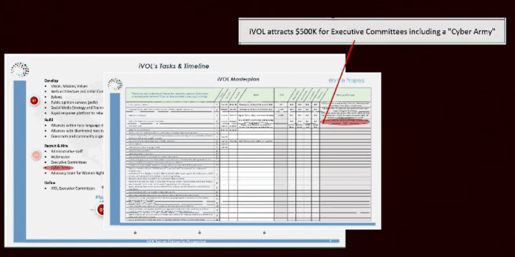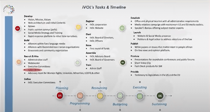 این برنامهریزی که در سال 2022 انجام شده بود، قرار بود در سال 2025 الی 2026 محقق شده و قرار بود برای به رسمیت شناختهشدن دولت اپوزیسیون به سازمان ملل ارائه شود.500 هزار دلار نیز برای تشکیل ارتش سایبری تعیین شد تا ضمن تخریب چهره جمهوری اسلامی، راه را برای محبوبیت پهلوی باز کند. حتی برای خوش خدمتی به نتانیاهو، تقدیرنامهای به او اهدا میکنند.