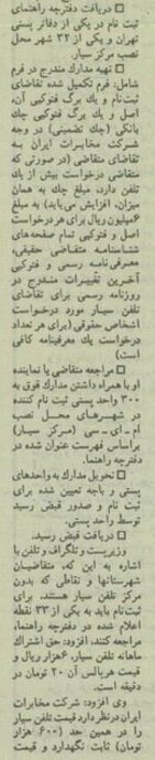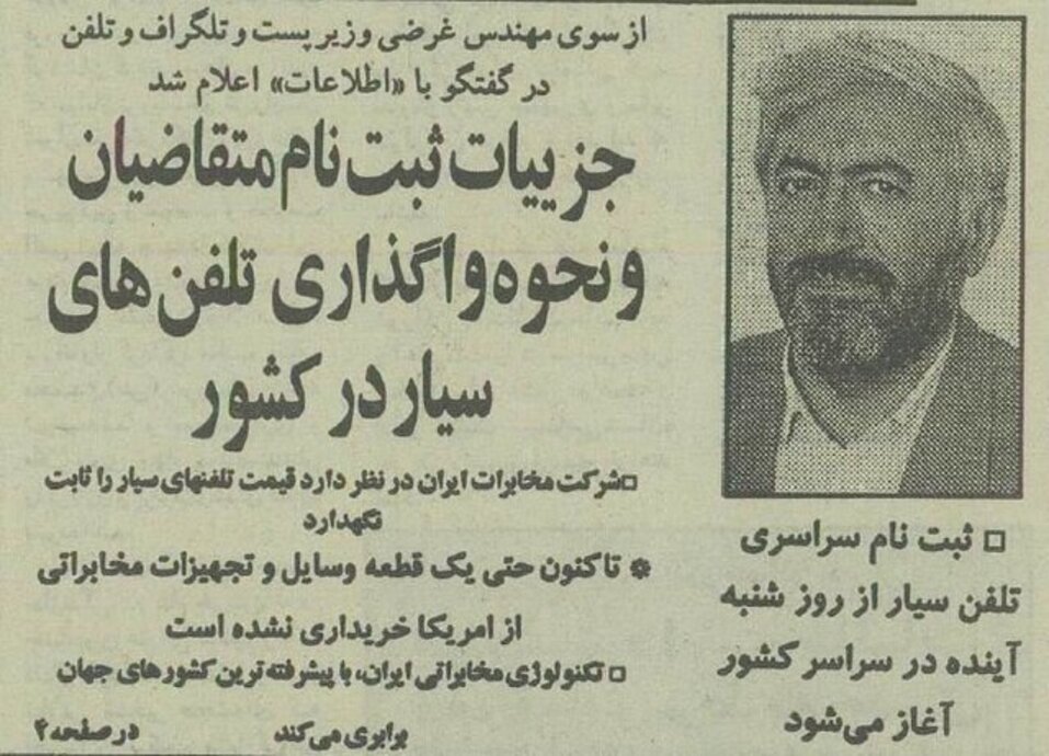 به گزارش صراط به نقل از اطلاعات انلاین، در بهمن ۱۳۷۴ روزنامههای کشور آگهیهای ثبت نام پیش فروش اولین تلفنهای همراه در ایران را منتشر کردند. ۱۵ بهمن ۱۳۷۴ محمد غرضی وزیر وقت پست، تلگراف و تلفن شرایط پیش فروش تلفن همراه و قیمت تلفنهای همراه و هزینههای تلفن همراه در ایران را توضیح داد. قیمت هر دستگاه تلفن همراه در این پیش فروش ۶۰۰ هزار تومان، حق اشتراک ماهانه ۶ هزار تومان و قیمت هر پالس ۲۰ تومان ذکر شده بود. آگهی و بخشهای مهم گفتوگوی وزیر وقت را بخوانید و عکسی از یک دفتر پستی در خیابان شریعتی تهران در اولین ساعات آغاز پیش فروش تلفن همراه در تهران تماشا کنید.