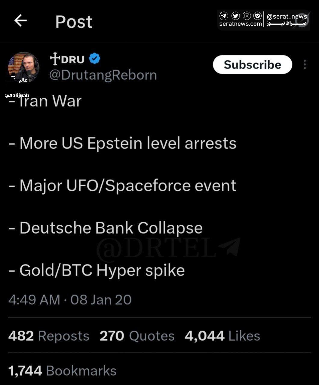 یک کاربر تو توییتر دقیقا ۶ سال پیش همچین توییتی زده: جنگ ایران دستگیری‌های بیشتر در سطح اپستین تو ایالات متحده رویداد بزرگ یوفو/نیروی فضایی فروپاشی دویچه بانک افزایش شدید قیمت طلا/بیت کوین