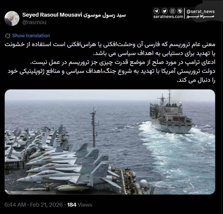 یک کاربر در توئیتر نوشت: معنی عام تروریسم که فارسی آن وحشتافکنی یا هراسافکنی است استفاده از خشونت یا تهدید برای دستیابی به اهداف سیاسی می باشد. ادعای ترامپ در مورد صلح از موضع قدرت چیزی جز تروریسم در عمل نیست. دولت تروریستی آمریکا با تهدید به شروع جنگ،اهداف سیاسی و منافع ژئوپلیتیکی خود را دنبال می کند.