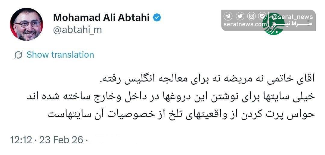 ابطحی در توییتی نوشت: خاتمی نه مریض است و نه به انگلیس رفته است.