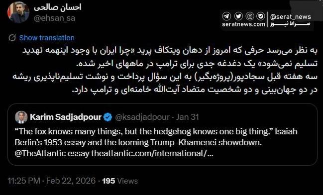 احسان صالحی، فعال رسانه در توئیتر نوشت: به نظر می‌رسد حرفی که امروز از دهان ویتکاف پرید «چرا ایران با وجود اینهمه تهدید تسلیم نمی‌شود» یک دغدغه جدی برای ترامپ در ماههای اخیر شده. سه هفته قبل سجادپور(پروژه‌بگیر) به این سؤال پرداخت و نوشت تسلیم‌ناپذیری ریشه در دو جهان‌بینی و دو شخصیت متضاد آیت‌الله خامنه‌ای و ترامپ دارد.