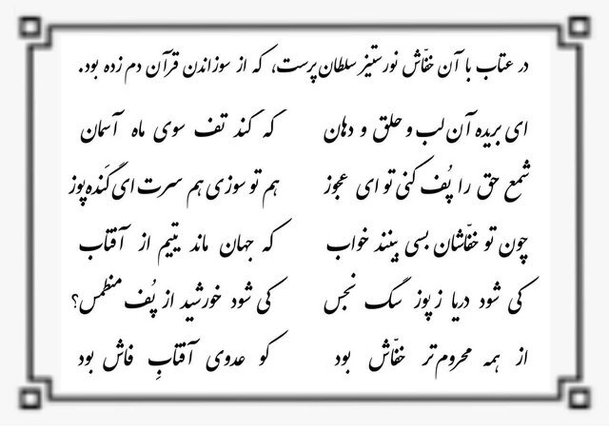 «در عتاب با آن خفاش نور ستیز سلطان پرست، که از سوزاندن قرآن دم زده بود.