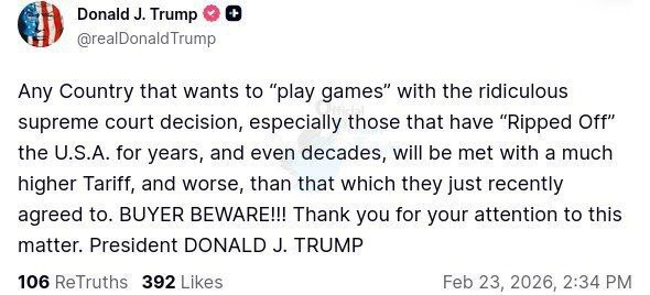 ترامپ نوشت: هر کشوری که بخواهد با تصمیم مضحک دیوان عالی «بازی کند»، به ویژه آنهایی که سالها و حتی دههها آمریکا را «چاپیدهاند»، با تعرفههای بسیار بالاتری مواجه خواهد شد، و حتی بدتر از آنهایی که اخیراً توافق کردهاند. خریدار، مراقب باش!!!