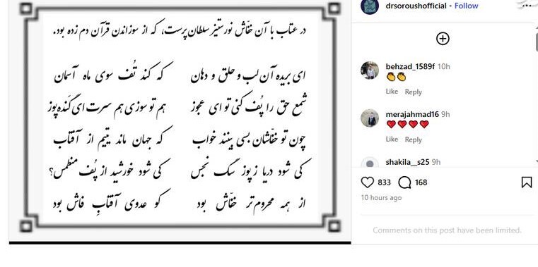 عبدالکریم سروش، پژوهشگر ایرانی، با انتشار شعری در صفحه شخصی خود در اینستاگرام نسبت به توییت علی کریمی درباره سوزاندن قرآن کریم واکنش نشان داد: