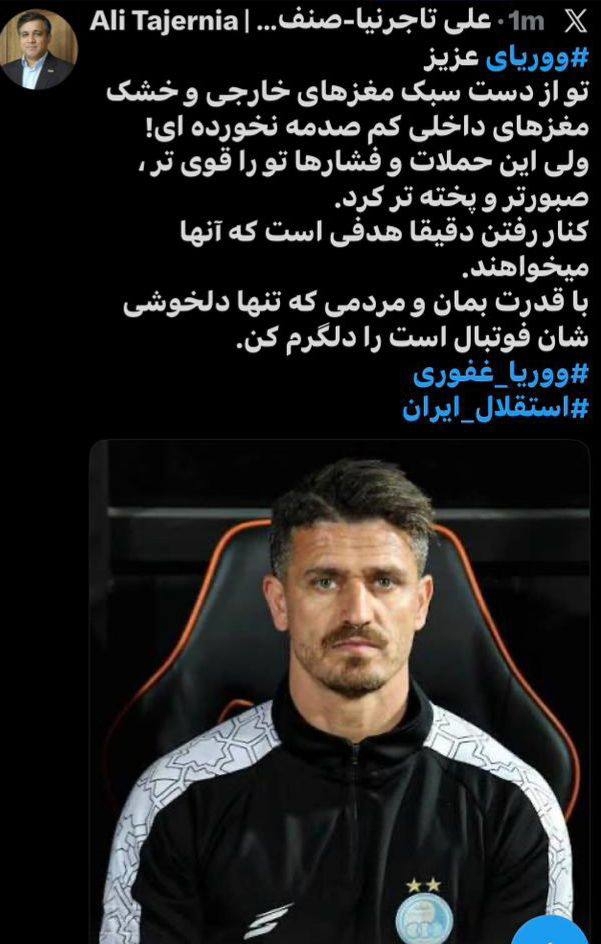 علی تاجرنیا توئیتی در حمایت از وریا غفوری منتشر کرد.