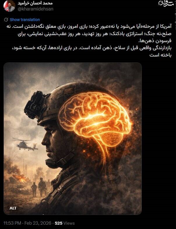 محمد احسان خرامید، در توئیتر نوشت: آمریکا از مرحله«آیا می‌شود یا نه»عبور کرده؛ بازی امروز، بازیِ معلق نگه‌داشتن است. نه صلح،نه جنگ؛ استراتژی بادکنک: هر روز تهدید، هر روز عقب‌نشینی نمایشی، برای فرسودن ذهن‌ها. بازدارندگی واقعی قبل از سلاح، ذهن آماده است. در بازی اراده‌ها، آن‌که خسته شود، باخته است.