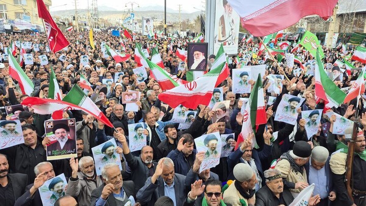 شرکت کنندگان تصاویر امام شهید انقلاب و رهبر جدید جمهوری اسلامی را در دست داشته و در حمایت از نظام اسلامی شعار سر می می دهند.