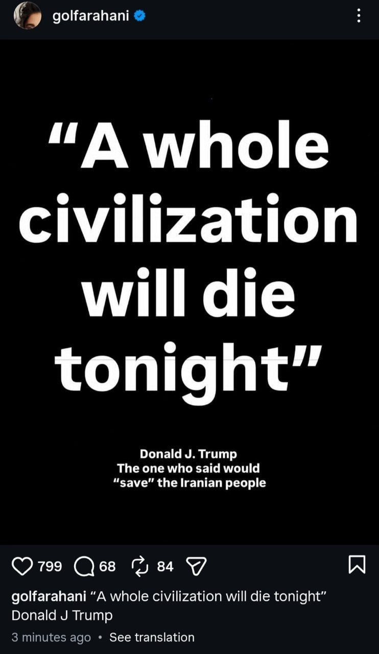 بازیگر درباره الی و میم مثل مادر نوشت؛ امشب یک تمدن کامل خواهد مرد - دونالد ترامپ  کسی که گفت مردم ایران را «نجات» می دهد.