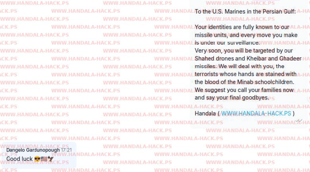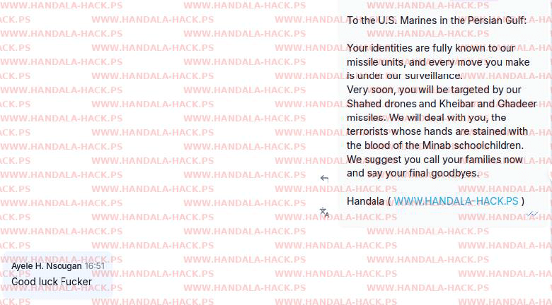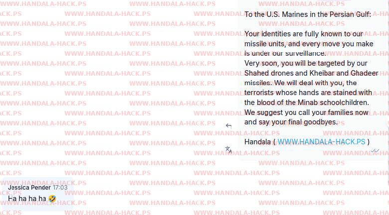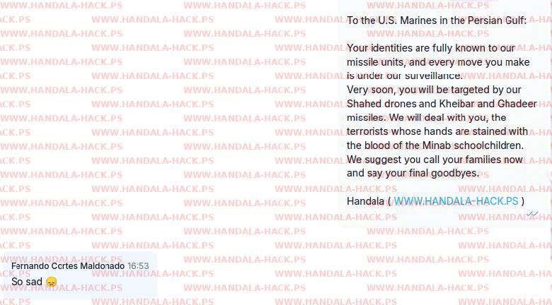 این گروه هکری همچنین به تفنگداران آمریکایی در خلیج فارس نیز هشدار داده: هویت شما به طور کامل برای واحدهای موشکی ما شناخته شده است و هر حرکت شما زیر نظر ماست. خیلی زود، توسط پهپادهای شاهد و موشکهای خیبر و غدیر هدف قرار خواهید گرفت. ما با شما - تروریستهایی که دستهایتان به خون دانشآموزان میناب آغشته است - برخورد خواهیم کرد. پیشنهاد میکنیم همین حالا با خانوادههایتان تماس بگیرید و آخرین وداع را انجام دهید.