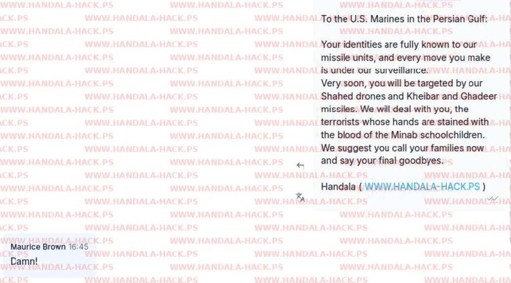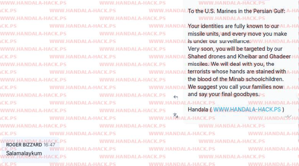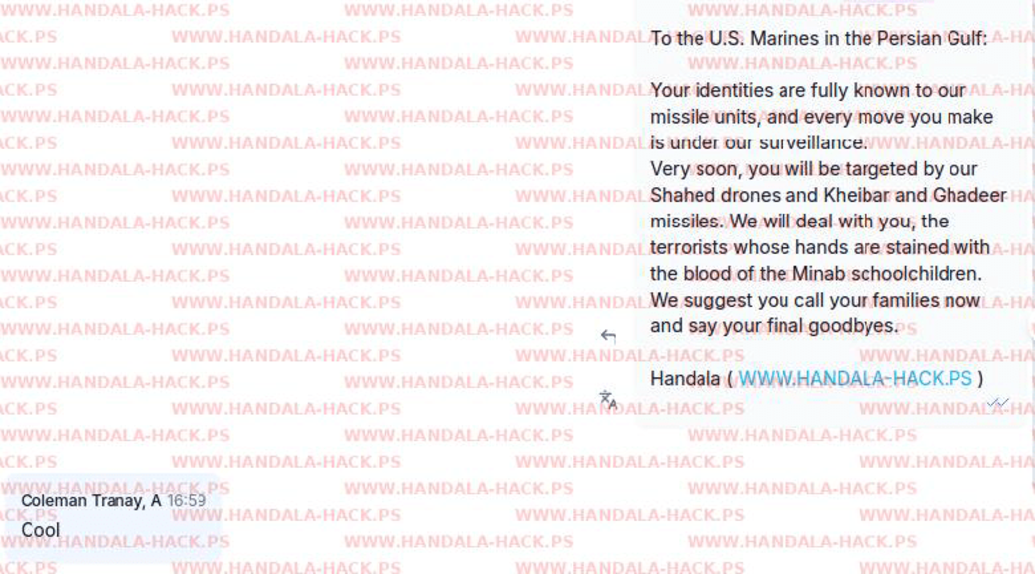 در این بیانیه که گفته شده حنظله به صورت مستقیم برای تفنگداران آمریکایی از طریق واتساپ پیام ارسال کرده و گفته که «آنهایی که گمان میکردند هویتشان پنهان مانده، یک بار دیگر فکر کنند؛ هویت دهها هزار نفر از پرسنل نیروی دریایی آمریکا از پایگاههای عملیاتی گرفته تا فعالیتهای تفریحی و گشتهای خارج از وظیفه، کاملاً برای ما شناخته شده است.»