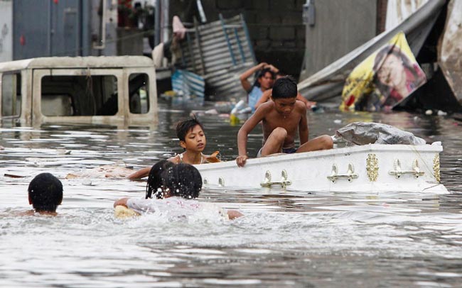 استفاده از تابوت به جای قایق برای فرار از امواج سیل در مانیل